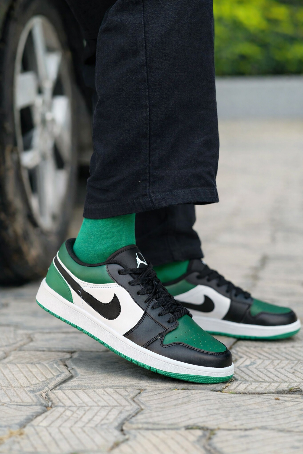 Iconic Jordan 1 Low silhouette featuring a crisp white base with black overlays and a bold green toe. Comfortable cushioning and a timeless design make it perfect for everyday wear and street-style fits at an affordable price.
